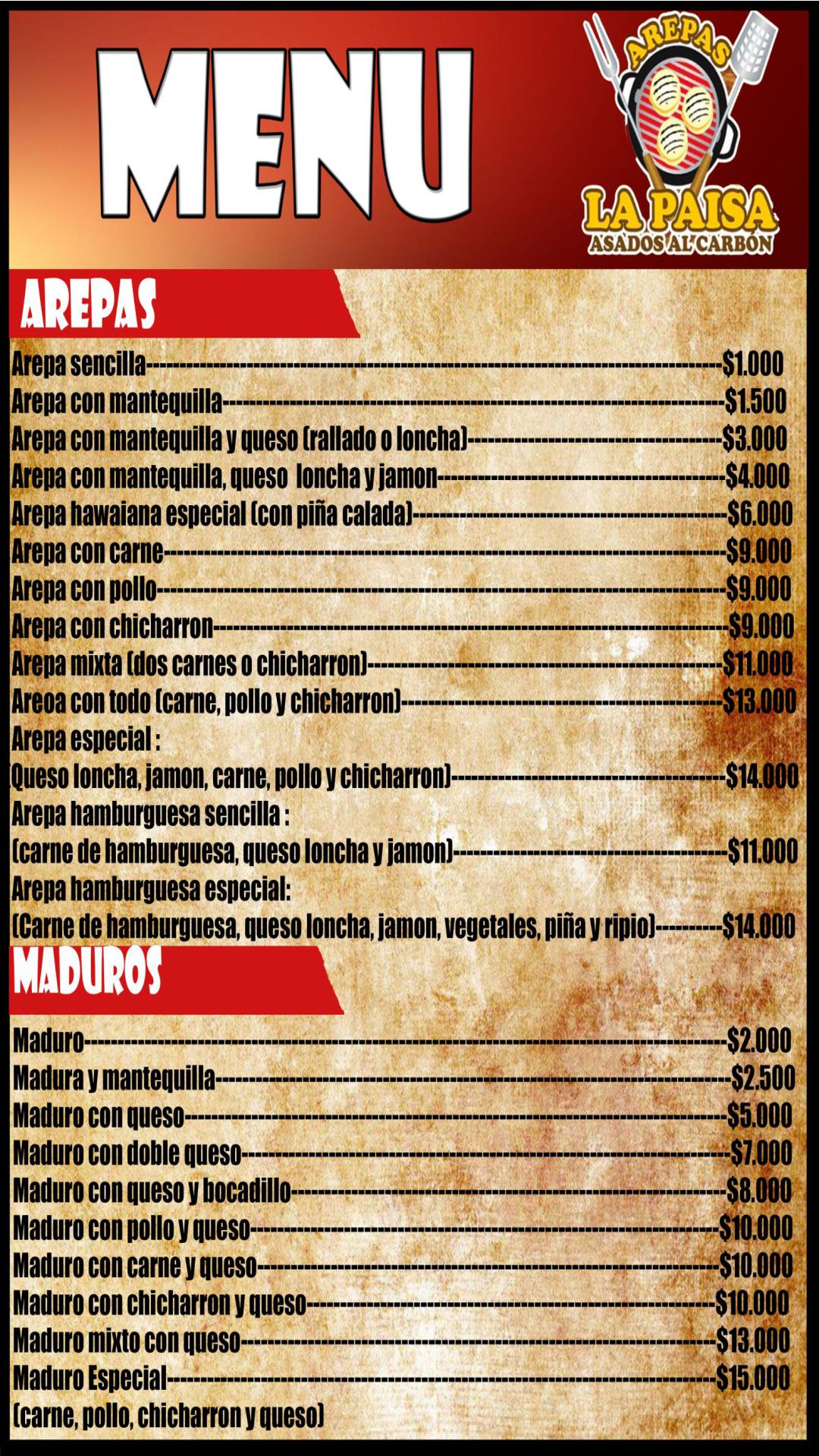 Arepas La Paisa es el lugar donde el sabor auténtico se disfruta en cada bocado. Te ofrecemos las mejores arepas con todo, asados, chuzos, chorizos, maduros rellenos, costilla y picadas, preparados con ingredientes frescos y al mejor estilo paisa.