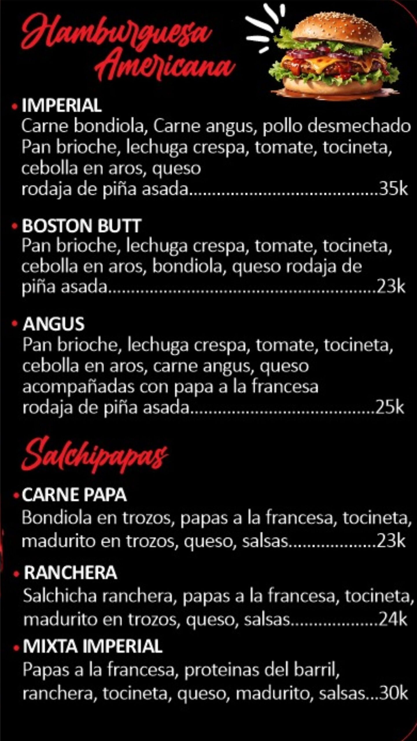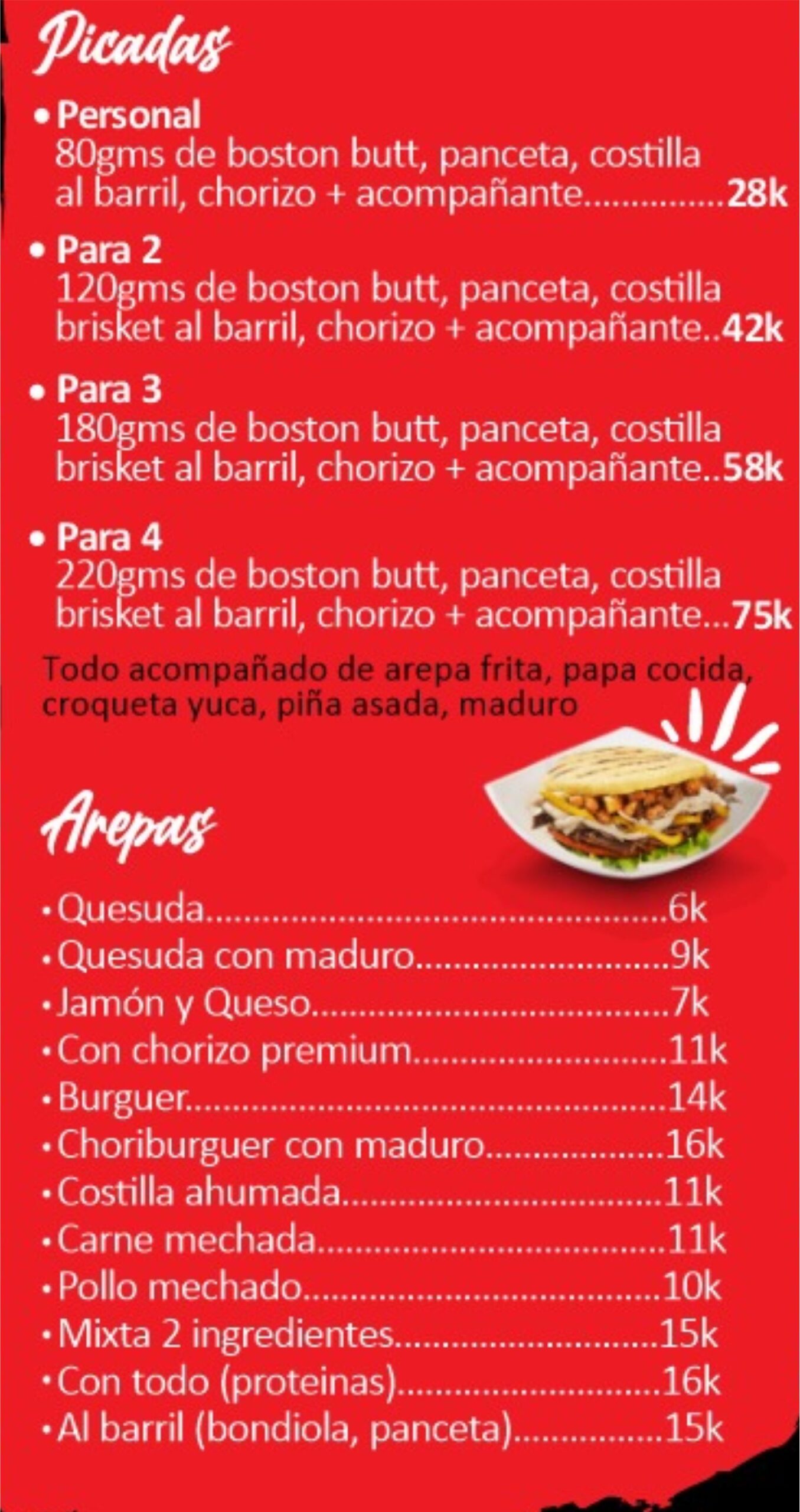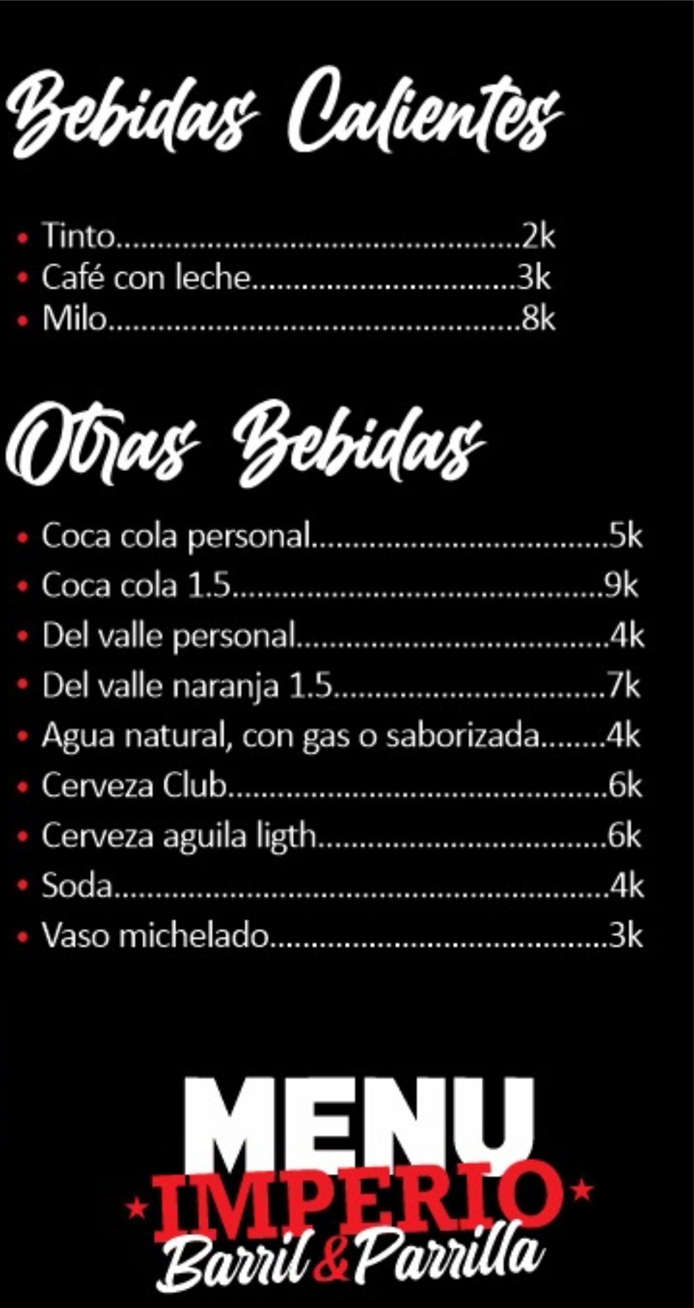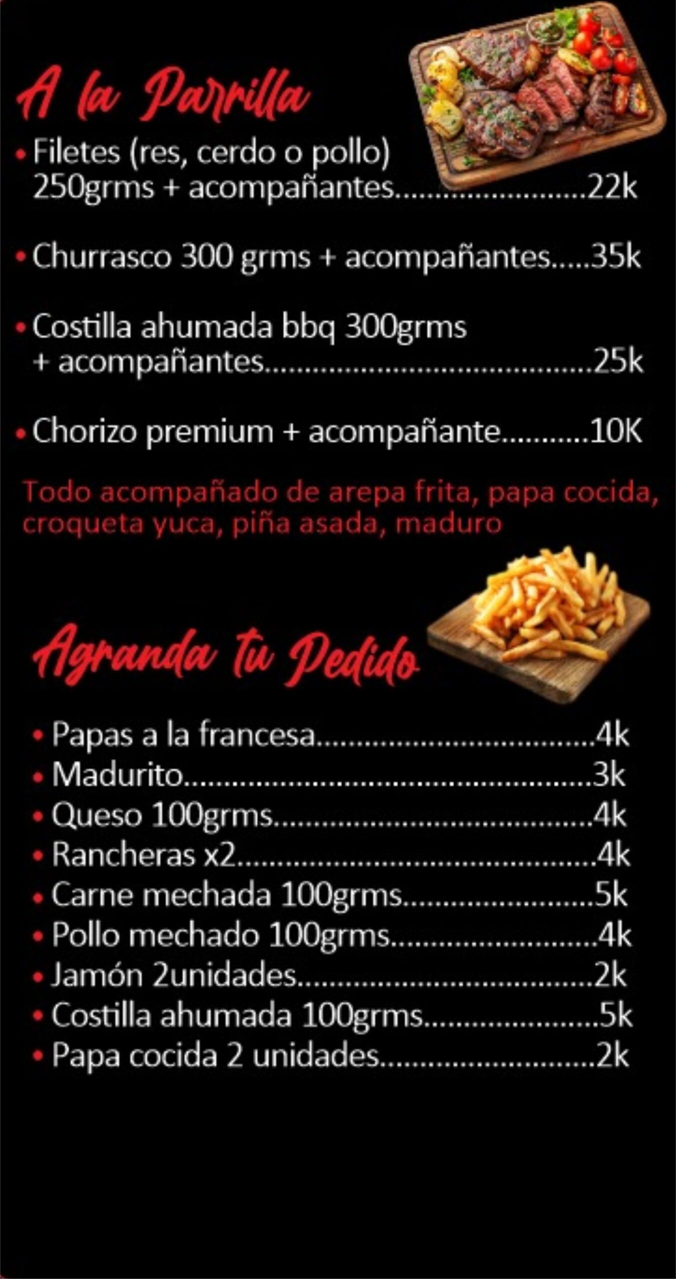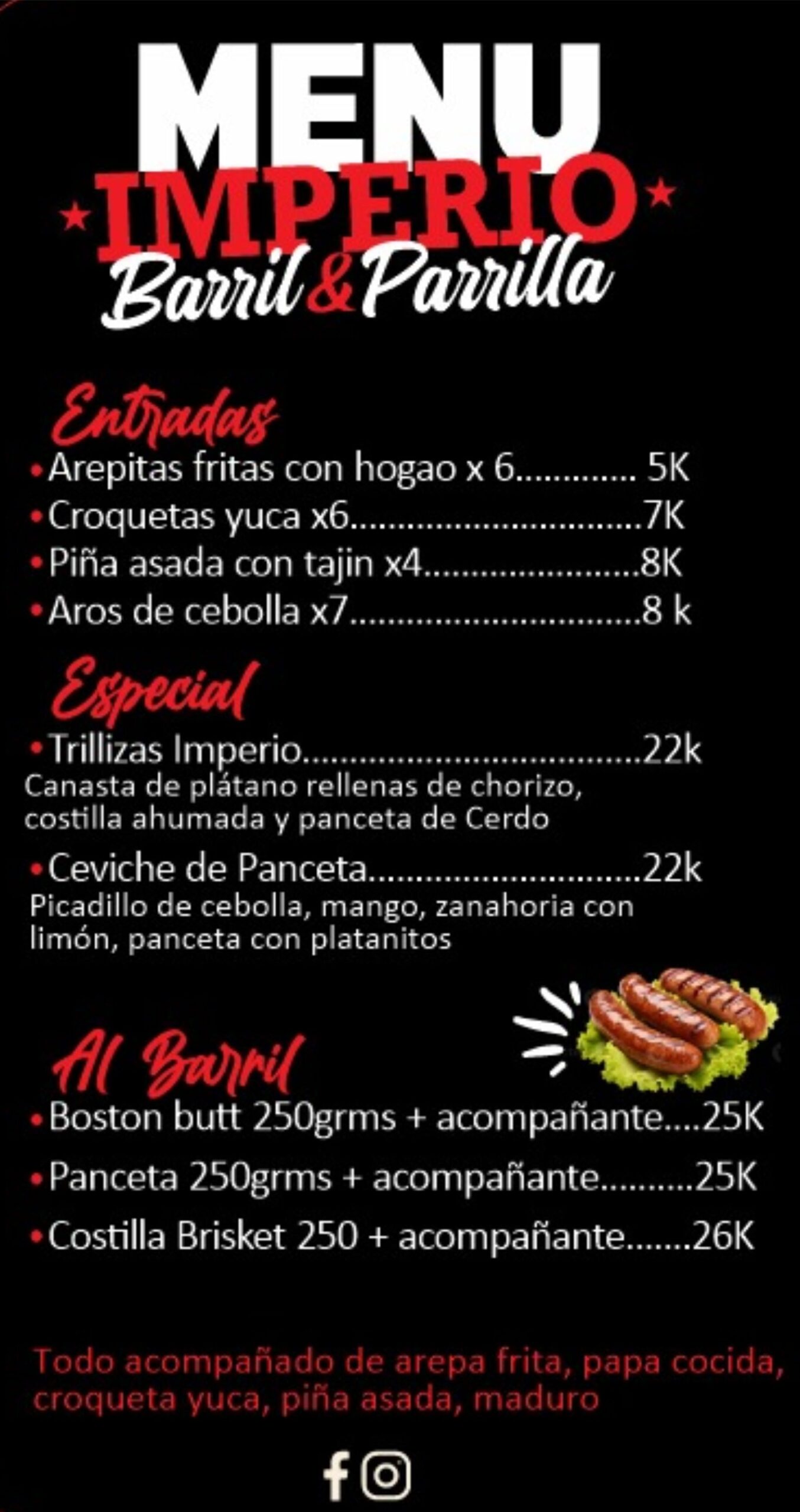 En Imperio Barril y Parrilla el sabor es el rey. Somos expertos en comidas rápidas y asados a la parrilla, con un menú pensado para complacer todos los antojos. Disfruta nuestras deliciosas arepas, salchipapas, hamburguesas jugosas, picadas para compartir, y una variedad de platos preparados con el mejor sabor casero.