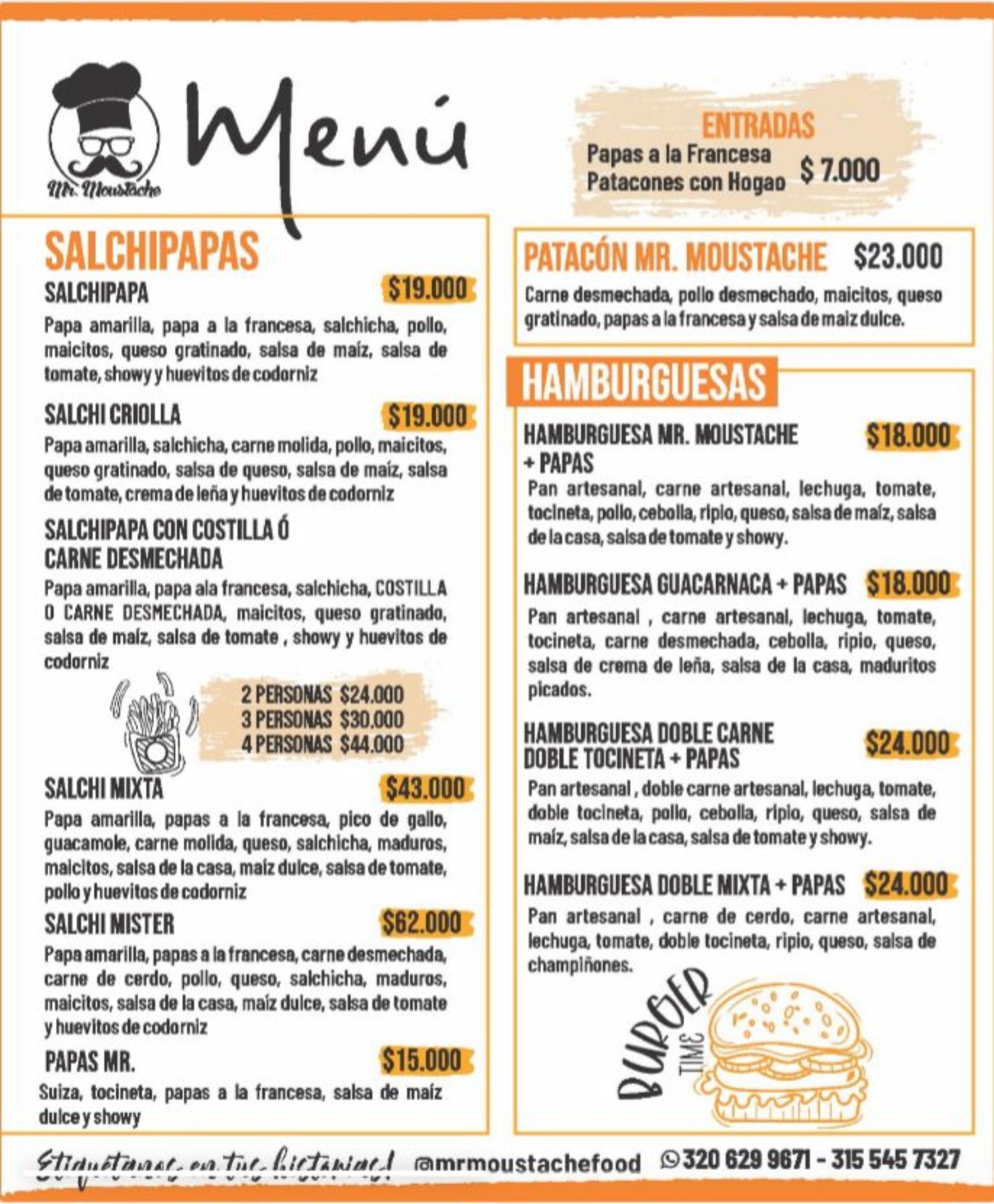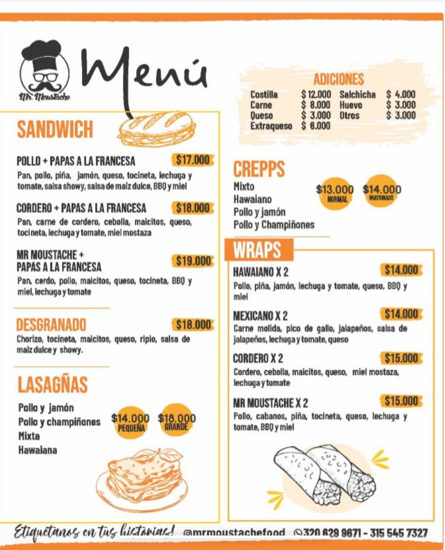 En Mr. Moustache Food, llevamos las comidas rápidas al siguiente nivel con sabores que sorprenden y combinaciones irresistibles. Nuestro menú, lleno de opciones deliciosas, es perfecto para quienes buscan disfrutar de un buen bocado sin complicaciones, pero con una calidad que se siente en cada mordida. Aquí encontrarás los mejores patacones, salchipapas generosamente servidas, desgranados repletos de sabor, y las lasagnas más cremosas, siempre frescas y listas para satisfacer tus antojos.