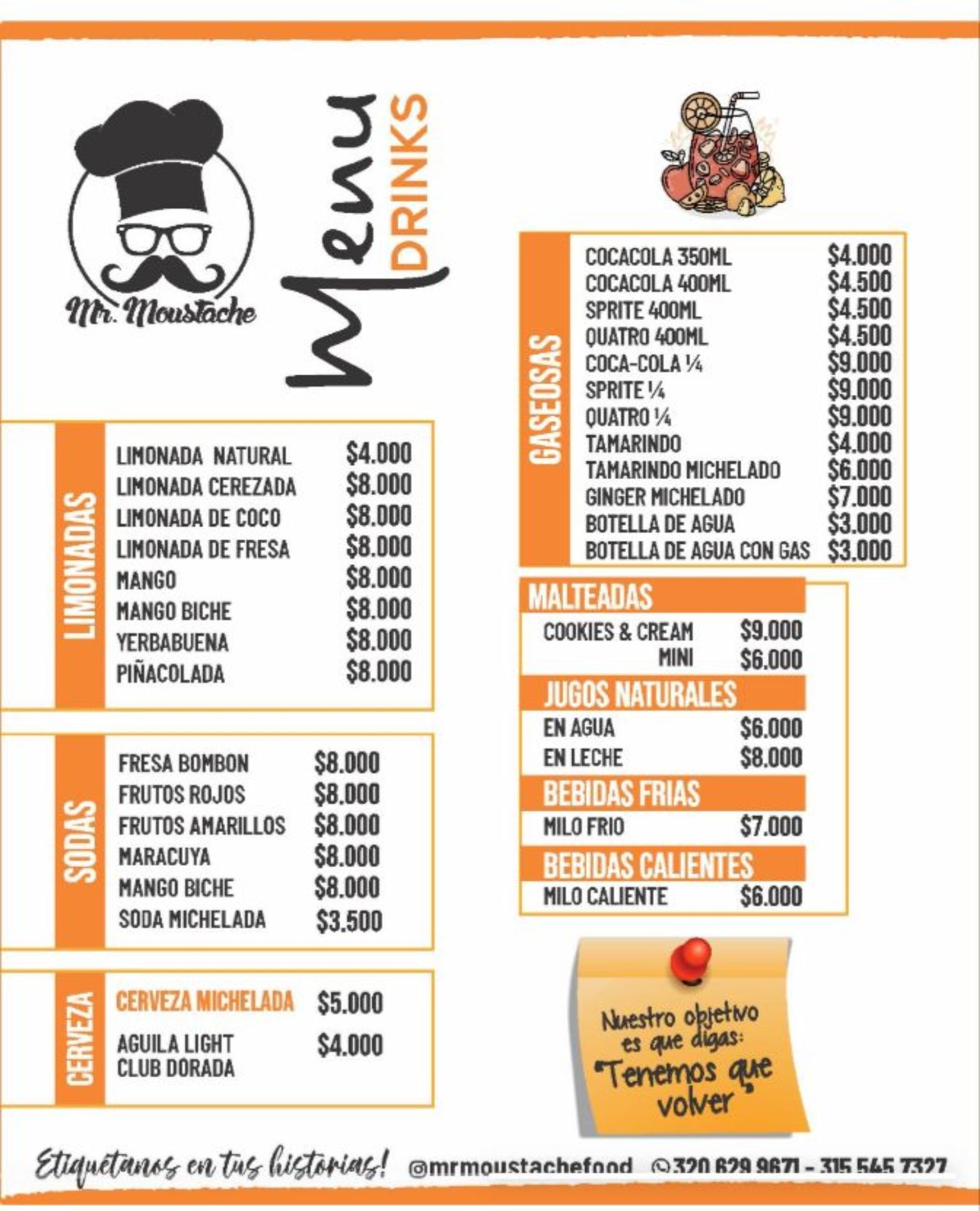 Cada plato en Mr. Moustache Food está preparado con ingredientes de alta calidad, y nuestro servicio está diseñado para brindarte momentos agradables, ya sea que elijas disfrutar de tu comida en nuestro espacio o pedir a domicilio para deleitarte desde la comodidad de tu hogar. ¡Déjanos ser tu elección en comidas rápidas y descubre por qué Mr. Moustache Food se ha convertido en el lugar favorito para los amantes de los buenos sabores!